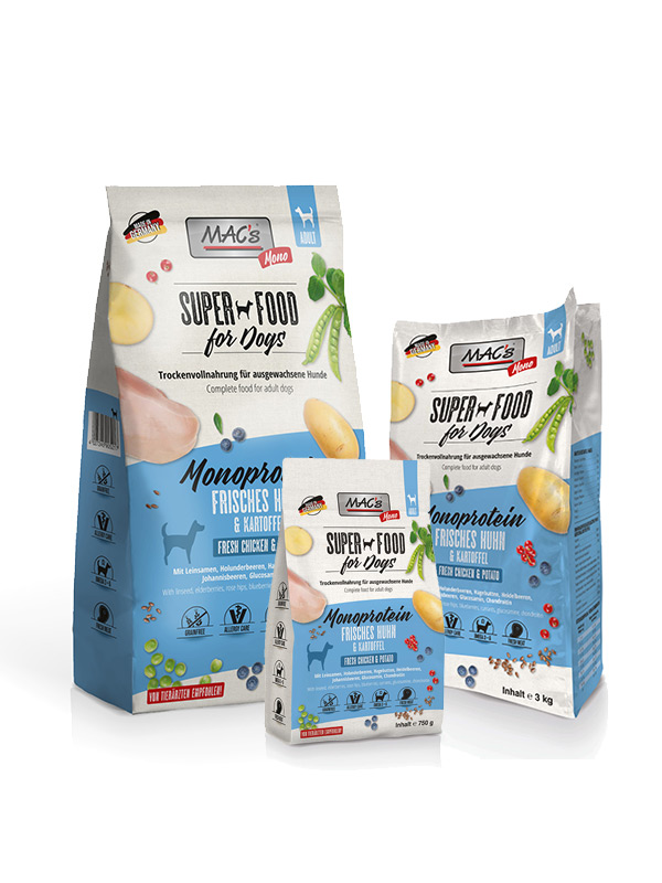 MAC’s monoproteinska hrana je posebej razvita za pse, ki so občutljivi in nagnjeni k alergijam. Osnova je izključno piščančje meso kot edini vir beljakovin v kombinaciji s krompirjem. Ta kombinacija skupaj z lanenimi semeni in morskimi algami zagotavlja uravnoteženo prehrano in hkrati posebno poslastico za vašega psa.