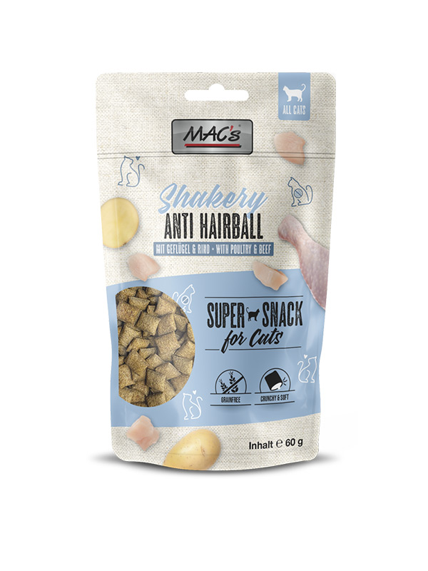 MAC’s Shakery je okusen prigrizek za vašo mačko. Zunaj hrustljav in polnjen z nežno kremo z okusom perutnine in z dodanim sladom za zmanjševanje težav z dlakami. Potresite z vrečko in videli boste, kako hitro vaša mačka priteče k vam po svoj prigrizek!
