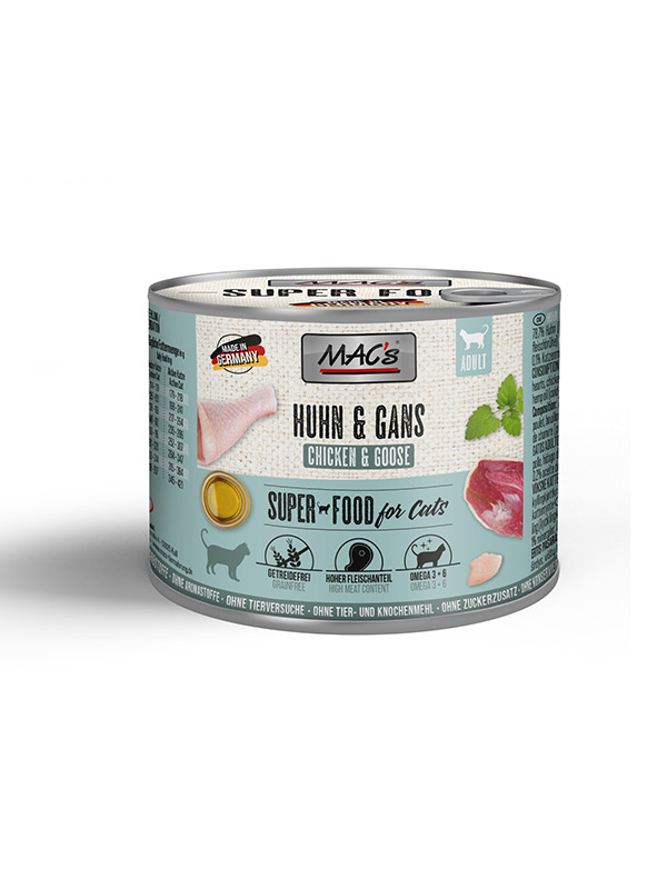 Okusna kombinacija sočnega piščanca in mehke gosi v kombinaciji s konopljinim oljem in mačjo meto. Hladno stiskano konopljino olje oskrbi vašo mačko z omega 3 in omega 6 maščobnimi kislinami za voljno dlako in močno kožno zaščito. Posebna receptura vsebuje več kot 98 % svežega mesa in je brez žitaric. Nežna priprava in dodatek vitaminov in mineralov poskrbita za naravno prehrano vaše mačke.