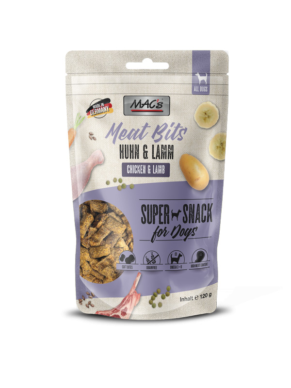 MAC’s MEAT BITS prigrizki s piščancem in jagnjetino so še posebej okusni, saj vsebujejo veliko svežega mesa. Visok delež mesa in receptura brez žitaric v kombinaciji s sadjem in zelenjavo poskrbita za polnovreden priboljšek. Vaš pes jih bo oboževal! Primerni so za pse vseh velikosti in za vsa življenjska obdobja.