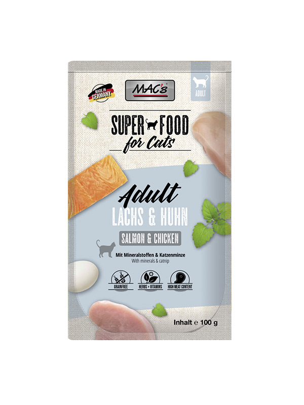 Mokra hrana MAC’s v vrečki je kombinacija lososa in piščanca, ki navduši vsako mačko. Losos vsebuje pomembne omega maščobne kisline, dodane brusnice pa pozitivno vplivajo na sečila. Zeliščna mešanica prinaša poseben okus in vsebuje veliko pomembnih vitaminov, mineralov in naravne antioksidante. Posebna brezžitna receptura je razvita kot uravnotežena, popolna. naravna prehrana za vašo mačko z vsemi potrebnimi vitamin in minerali, ki jih potrebuje.