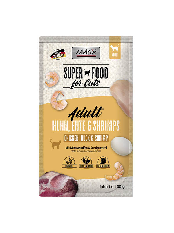 Mokra hrana MAC’s v vrečki je okusna kombinacija nežne race in slastnih morskih sadežev. Zeliščna mešanica prinaša poseben okus in vsebuje veliko pomembnih vitaminov, mineralov in naravne antioksidante. Posebna brezžitna receptura je razvita kot uravnotežena, popolna naravna prehrana za vašo mačko z vsemi potrebnimi vitamin in minerali, ki jih potrebuje.