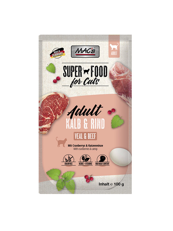 Mokra hrana MAC’s v vrečki je bogata z mesom govedine z dodatkom brusnic. Brusnice blagodejno delujejo na sečne poti in lahko pomagajo pri preprečevanju bolezni sečil. Zeliščna mešanica prinaša poseben okus in vsebuje veliko pomembnih vitaminov, mineralov in naravne antioksidante. Posebna brezžitna receptura je razvita kot uravnotežena, popolna naravna prehrana za vašo mačko z vsemi potrebnimi vitamin in minerali, ki jih potrebuje.