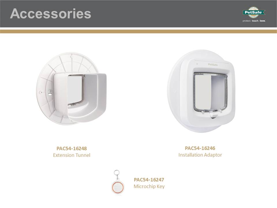 Ob nakupu vrat se priporoča nakup maske za vrata (koda 231103 bela, 231107 rjava), ki prepreči negativen vpliv kovinskih delov v vratih na delovanje mikročip vrat. Vrata lahko s pomočjo ključka (koda 231108) uporabljajo tudi nečipirani mački.