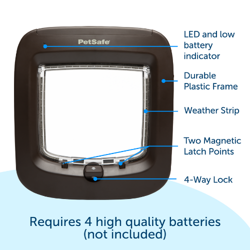 Vrata imajo vgrajeno tehnologijo, ki omogoča selektivni prehod mačkom, ki imajo vsajen čip, tujim mačkom ali divjim živalim pa prehod ni omogočen.